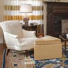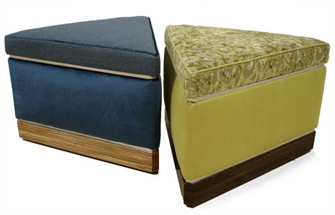 The triangular Tt & Viv Ottomans feature a fixed cushion with upholstered sides broken by two silver leaf inlays and a Macassar ebony or Zebra wood base enclosing recessed casters. more information wood stains